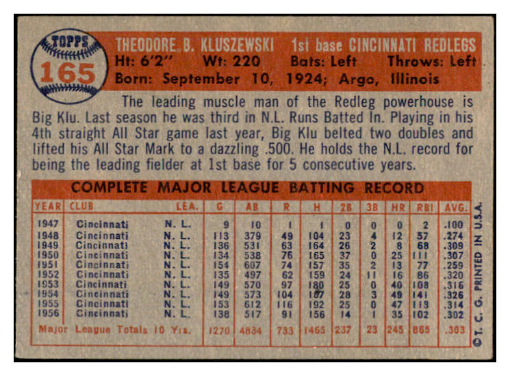 1957 Topps Baseball #165 Ted Kluszewski Reds VG-EX 532485