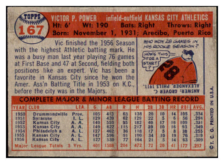 1957 Topps Baseball #167 Vic Power A's EX-MT 531021