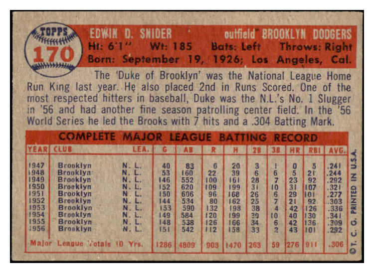 1957 Topps Baseball #170 Duke Snider Dodgers EX 522424