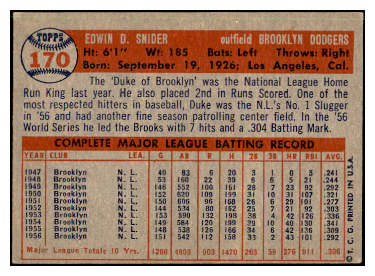 1957 Topps Baseball #170 Duke Snider Dodgers EX+/EX-MT 537367