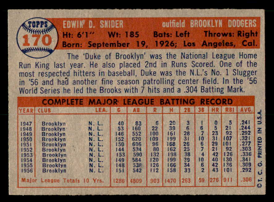 1957 Topps Baseball #170 Duke Snider Dodgers NR-MT 539543
