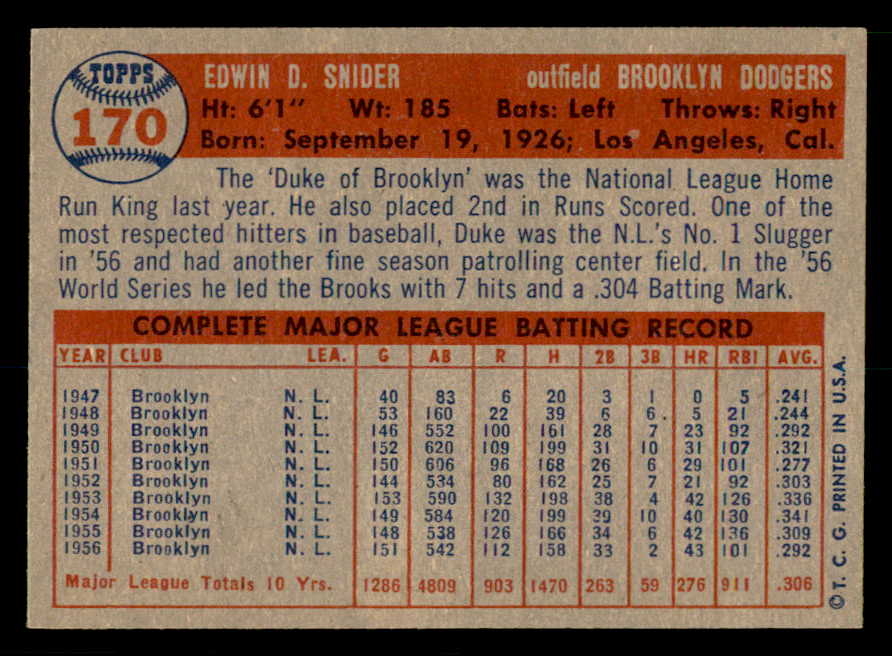 1957 Topps Baseball #170 Duke Snider Dodgers NR-MT 539551