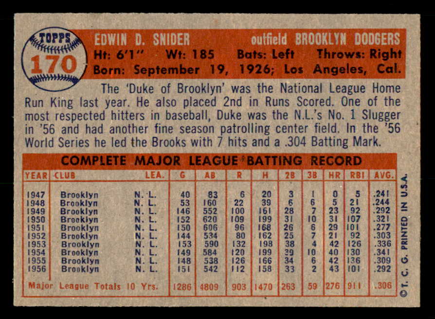 1957 Topps Baseball #170 Duke Snider Dodgers NR-MT 539552