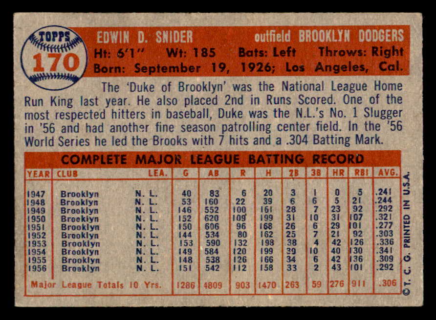 1957 Topps Baseball #170 Duke Snider Dodgers VG-EX 538780