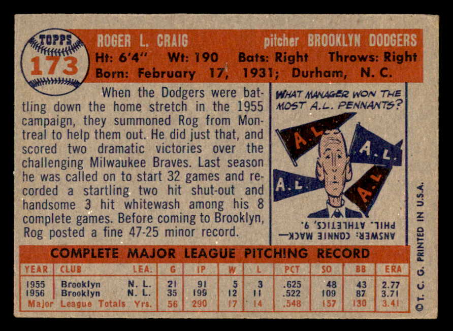 1957 Topps Baseball #173 Roger Craig Dodgers VG-EX 540117