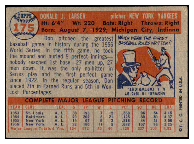 1957 Topps Baseball #175 Don Larsen Yankees EX 532513