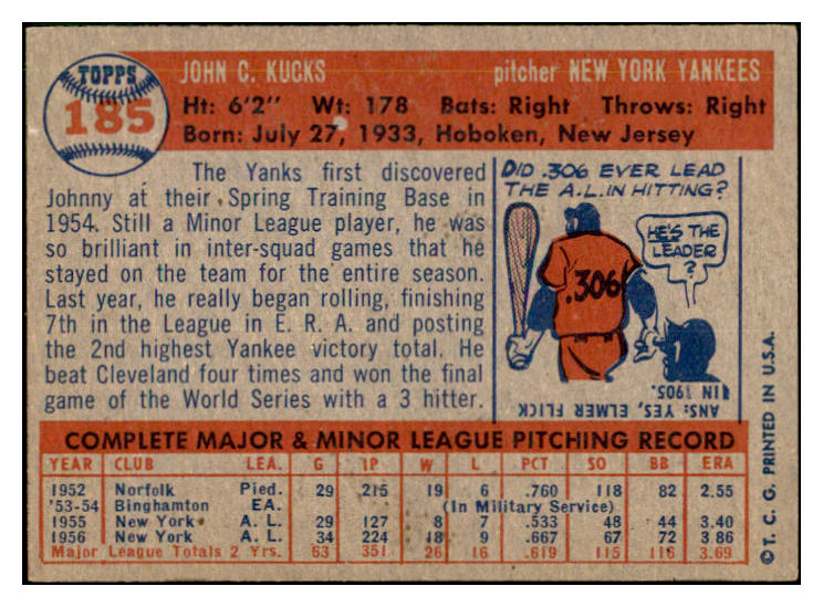 1957 Topps Baseball #185 Johnny Kucks Yankees EX-MT 535465