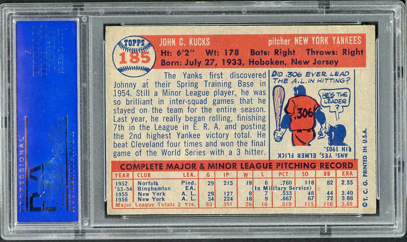 1957 Topps Baseball #185 Johnny Kucks Yankees PSA 8 NM/MT 537972