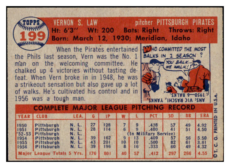 1957 Topps Baseball #199 Vern Law Pirates EX 523797