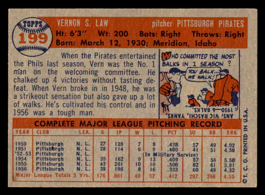 1957 Topps Baseball #199 Vern Law Pirates NR-MT 540027