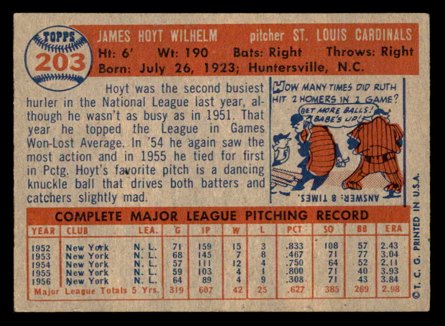 1957 Topps Baseball #203 Hoyt Wilhelm Cardinals VG-EX 541273