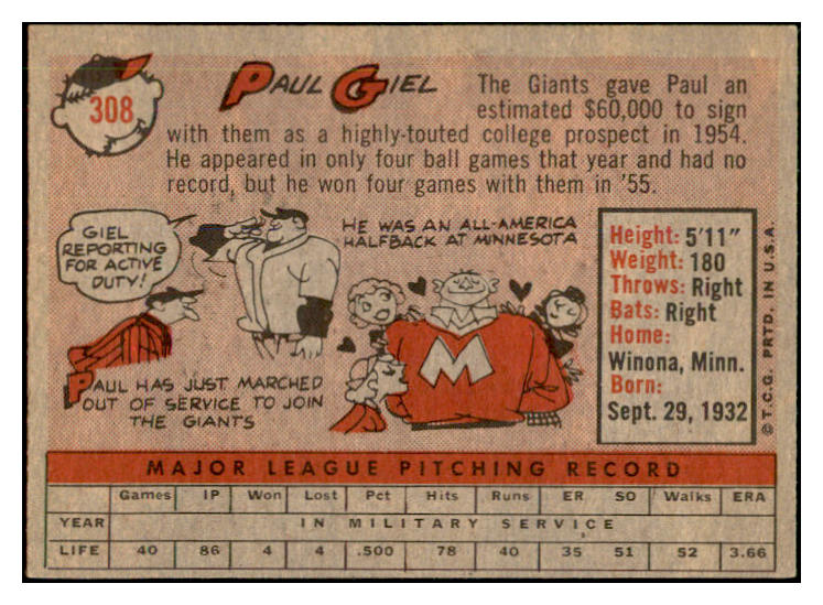 1958 Topps Baseball #308 Paul Giel Giants EX-MT 535902