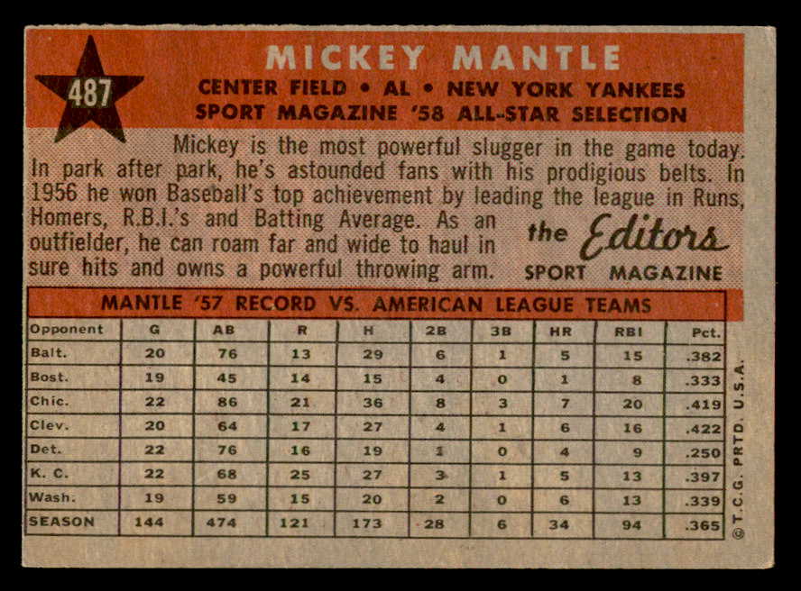1958 Topps Baseball #487 Mickey Mantle A.S. Yankees VG-EX 538896