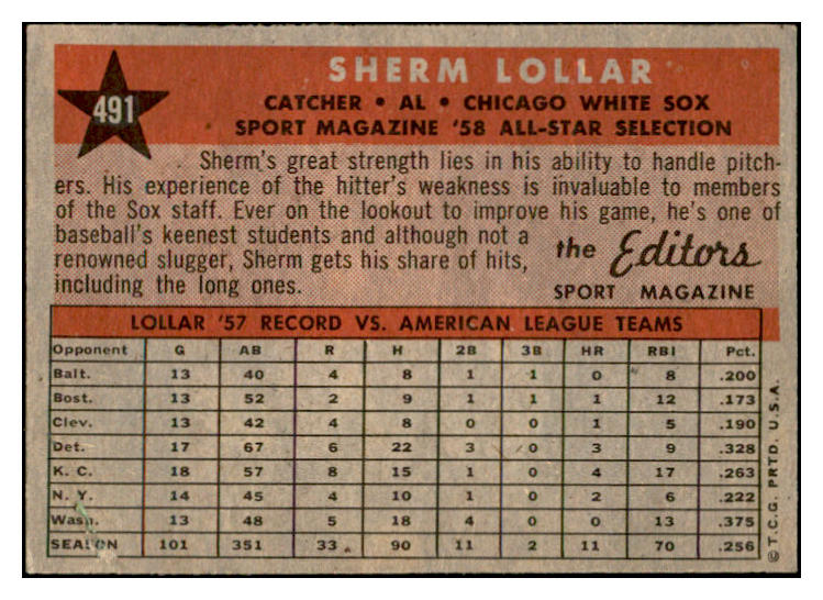 1958 Topps Baseball #491 Sherm Lollar A.S. White Sox EX-MT 536105