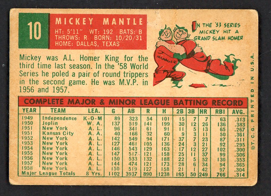 1959 Topps Baseball #010 Mickey Mantle Yankees VG 543291