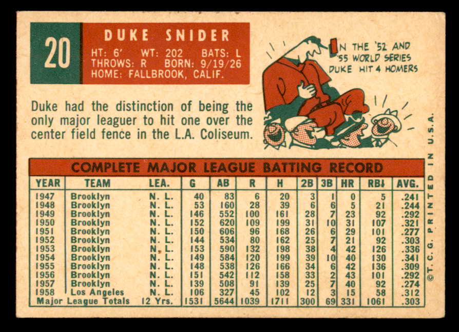 1959 Topps Baseball #020 Duke Snider Dodgers EX-MT 538803
