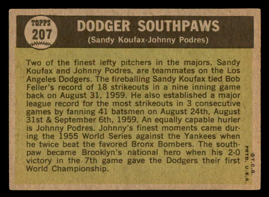 1961 Topps Baseball #207 Sandy Koufax Johnny Podres EX 540318