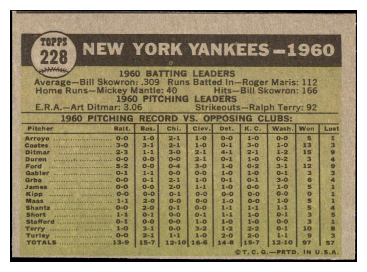 1961 Topps Baseball #228 New York Yankees Team EX 527539