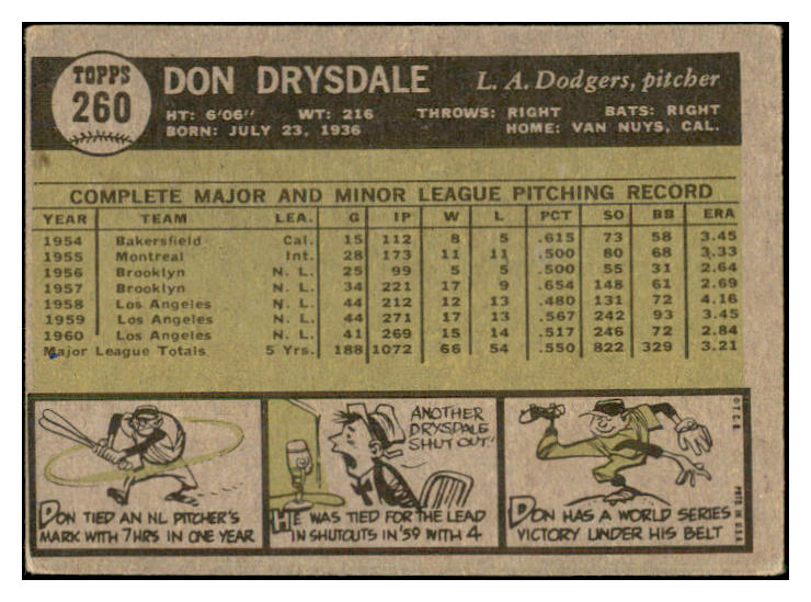 1961 Topps Baseball #260 Don Drysdale Dodgers VG 534470