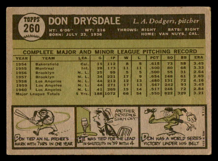 1961 Topps Baseball #260 Don Drysdale Dodgers VG 540430