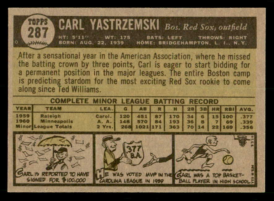 1961 Topps Baseball #287 Carl Yastrzemski Red Sox EX-MT 539587
