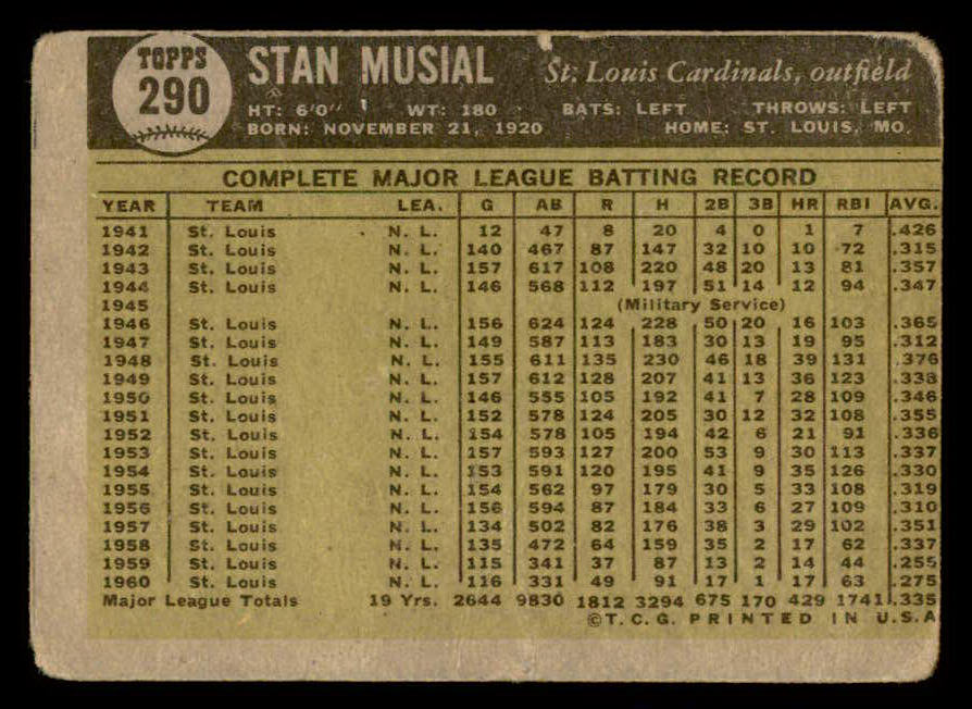 1961 Topps Baseball #290 Stan Musial Cardinals GD-VG 540374