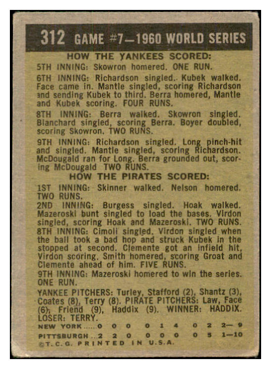 1961 Topps Baseball #312 World Series Game 7 Bill Mazeroski VG 534469