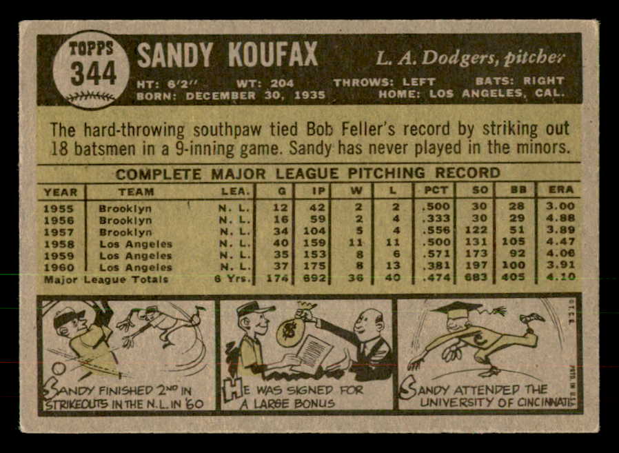 1961 Topps Baseball #344 Sandy Koufax Dodgers EX 541297