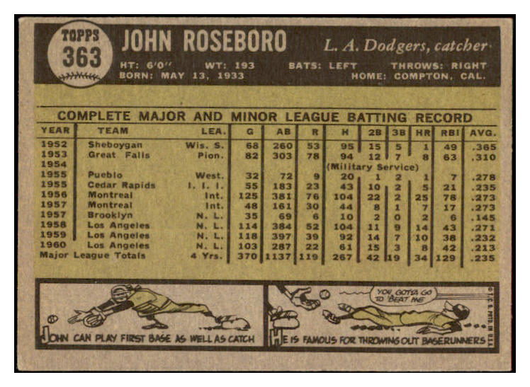 1961 Topps Baseball #363 John Roseboro Dodgers EX-MT 525500