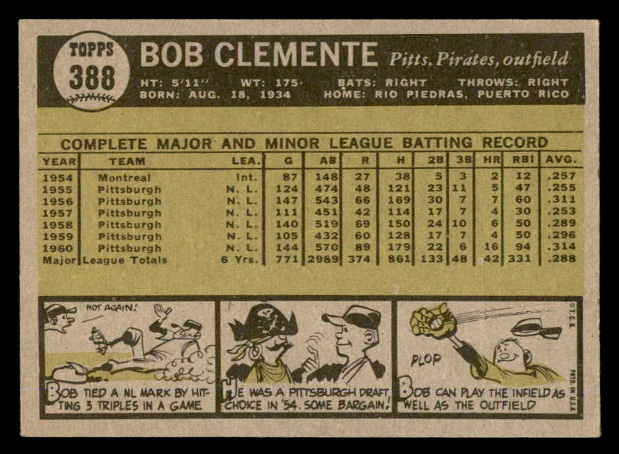 1961 Topps Baseball #388 Roberto Clemente Pirates EX 540442