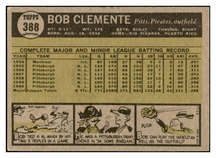 1961 Topps Baseball #388 Roberto Clemente Pirates EX+/EX-MT 536411