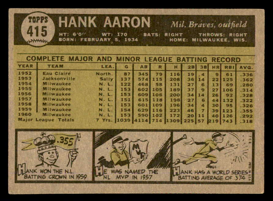 1961 Topps Baseball #415 Hank Aaron Braves VG-EX 540445