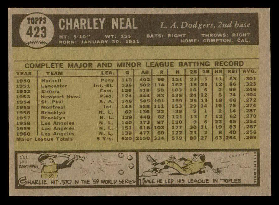 1961 Topps Baseball #423 Charlie Neal Dodgers EX-MT 540290
