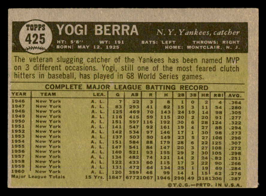 1961 Topps Baseball #425 Yogi Berra Yankees VG-EX 540443
