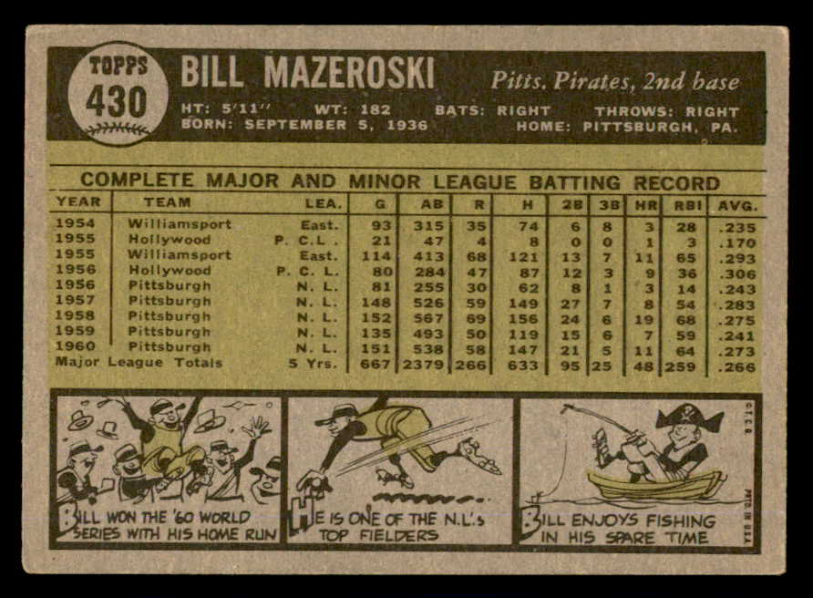 1961 Topps Baseball #430 Bill Mazeroski Pirates EX 540399