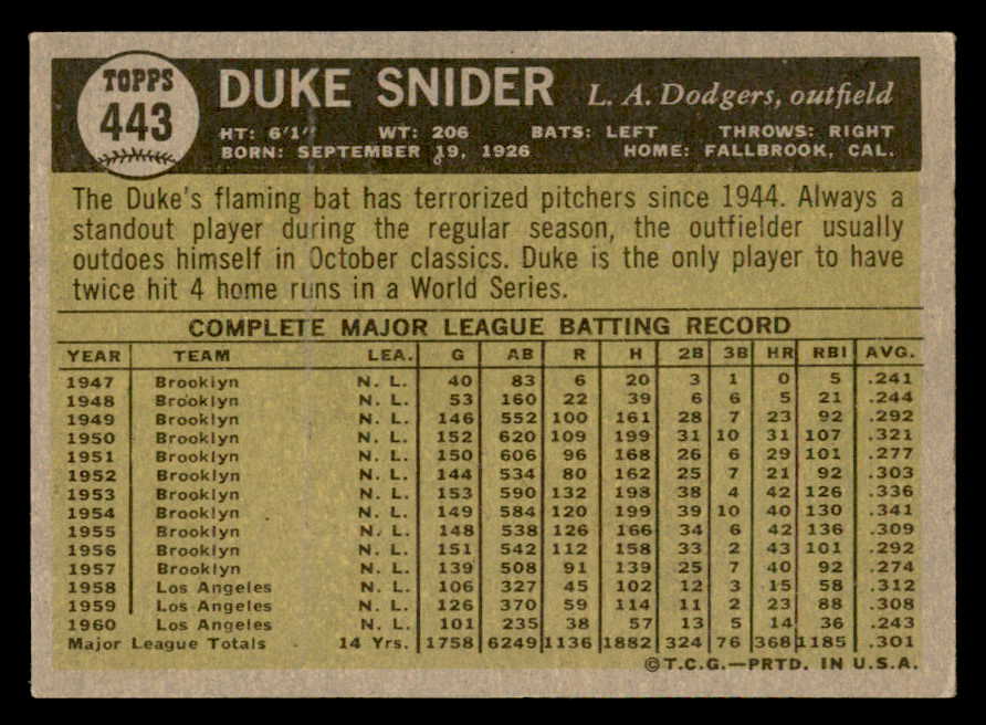 1961 Topps Baseball #443 Duke Snider Dodgers EX 540338