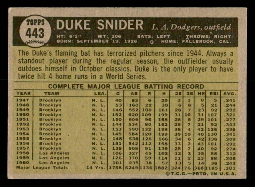 1961 Topps Baseball #443 Duke Snider Dodgers EX-MT 539592