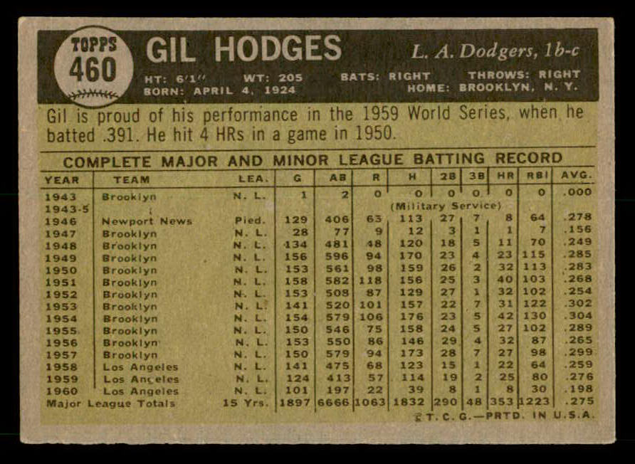 1961 Topps Baseball #460 Gil Hodges Dodgers EX-MT 539595