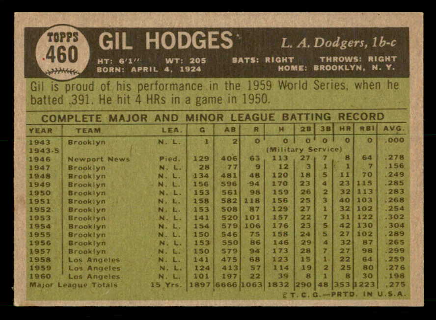 1961 Topps Baseball #460 Gil Hodges Dodgers EX-MT 539612