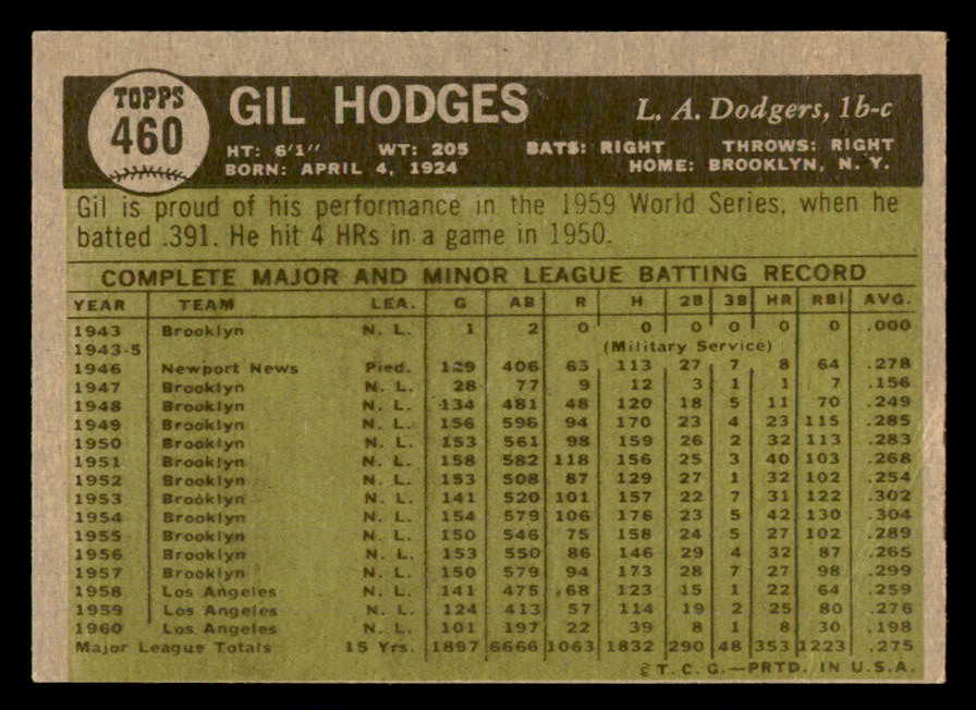 1961 Topps Baseball #460 Gil Hodges Dodgers VG-EX 540391