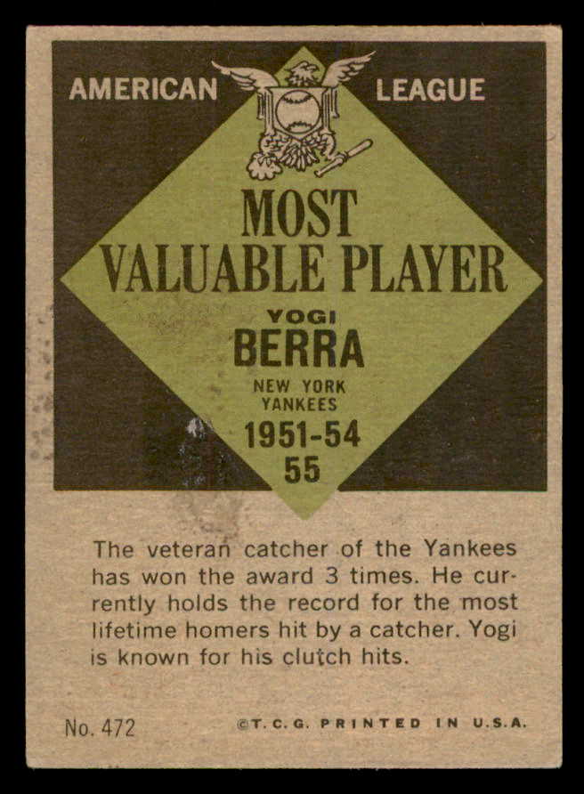 1961 Topps Baseball #472 Yogi Berra MVP Yankees EX 539387