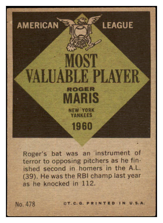 1961 Topps Baseball #478 Roger Maris MVP Yankees EX+/EX-MT 528929