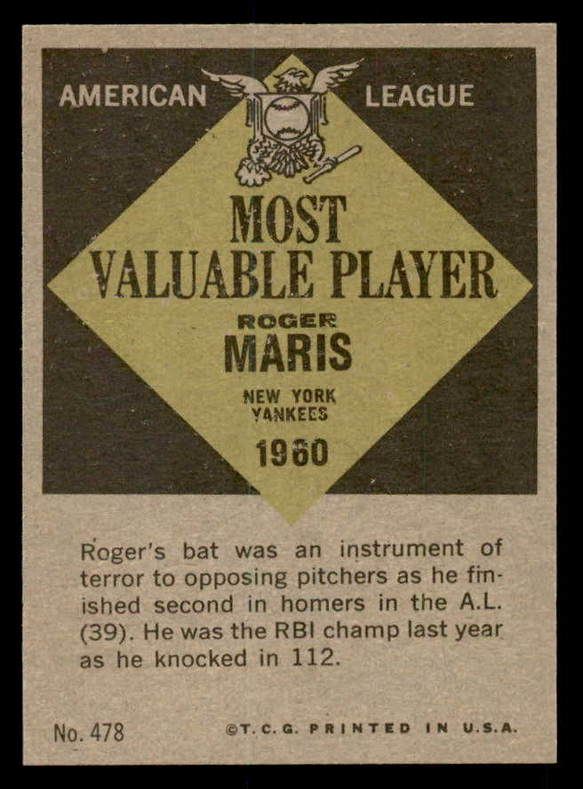 1961 Topps Baseball #478 Roger Maris MVP Yankees NR-MT 539576