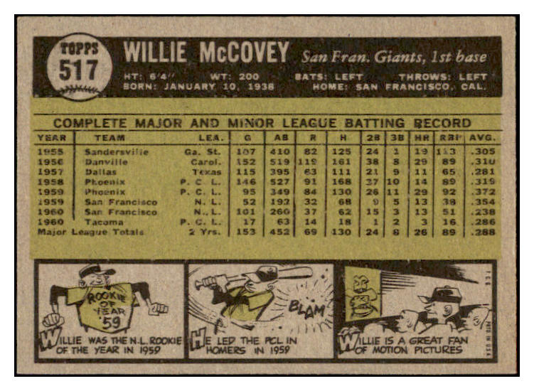 1961 Topps Baseball #517 Willie McCovey Giants EX-MT 529134