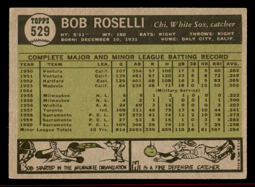 1961 Topps Baseball #529 Bob Roselli White Sox EX 542646