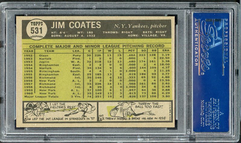 1961 Topps Baseball #531 Jim Coates Yankees PSA 7 NM 537964