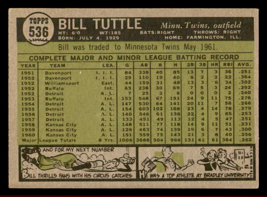 1961 Topps Baseball #536 Bill Tuttle Twins EX 542647