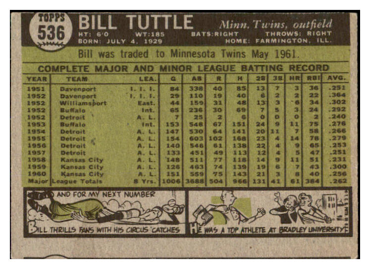 1961 Topps Baseball #536 Bill Tuttle Twins VG-EX 527829