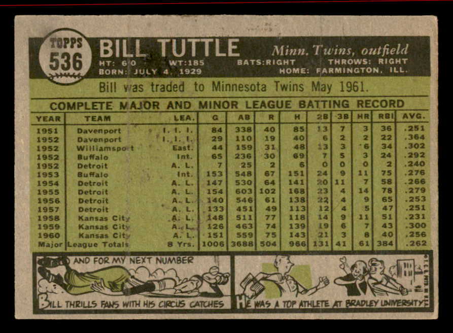 1961 Topps Baseball #536 Bill Tuttle Twins VG-EX 542796