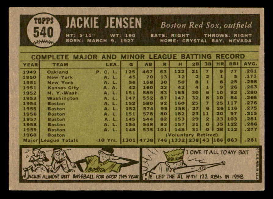 1961 Topps Baseball #540 Jackie Jensen Red Sox NR-MT 540294
